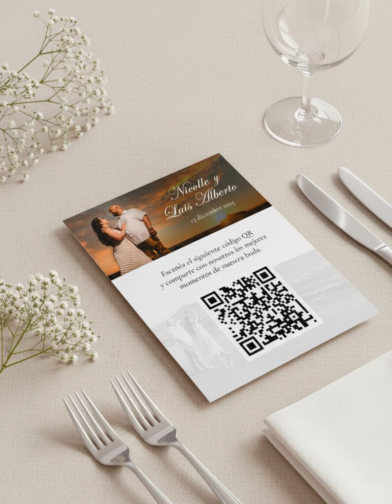 Código escaneable que dirige directamente a una plataforma donde tus invitados pueden cargar directamente las fotos durante tu evento.